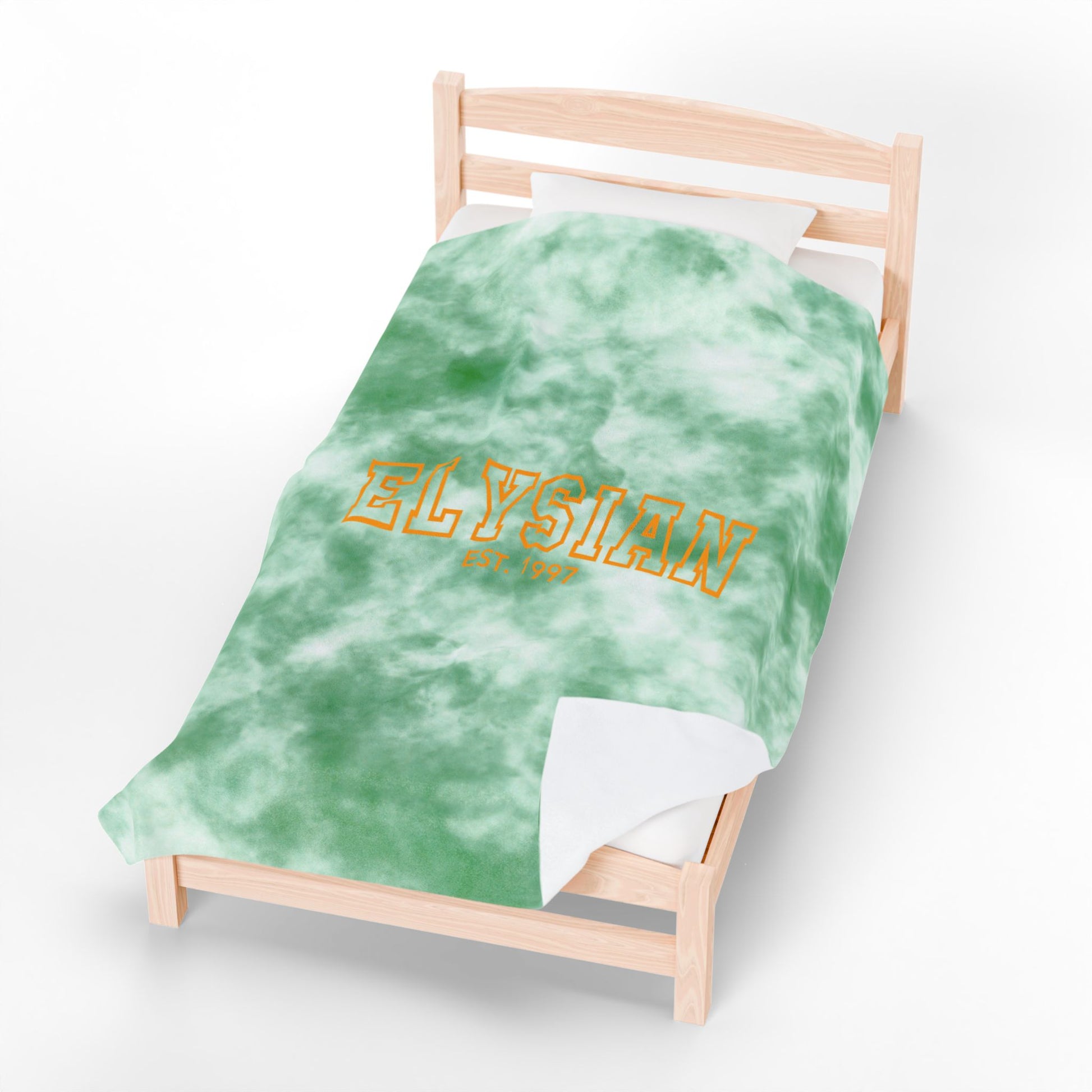 A velvety plush blanket in rich, collegiate green with bold white collegiate lettering that reads “ELYSIAN” and a subtle “EST. 1997” underneath. The fabric feels sumptuously soft and slightly weighty, folding easily over shoulders or across a couch. The print is vivid on one side, giving a clean, classic campus aesthetic that pairs well with relaxed evenings, study sessions, or quiet mornings with coffee. This blanket brings a cozy, nostalgic calm — like settling into a favorite chair after a long day, wrapped in a familiar emblem that quietly celebrates place and memory.