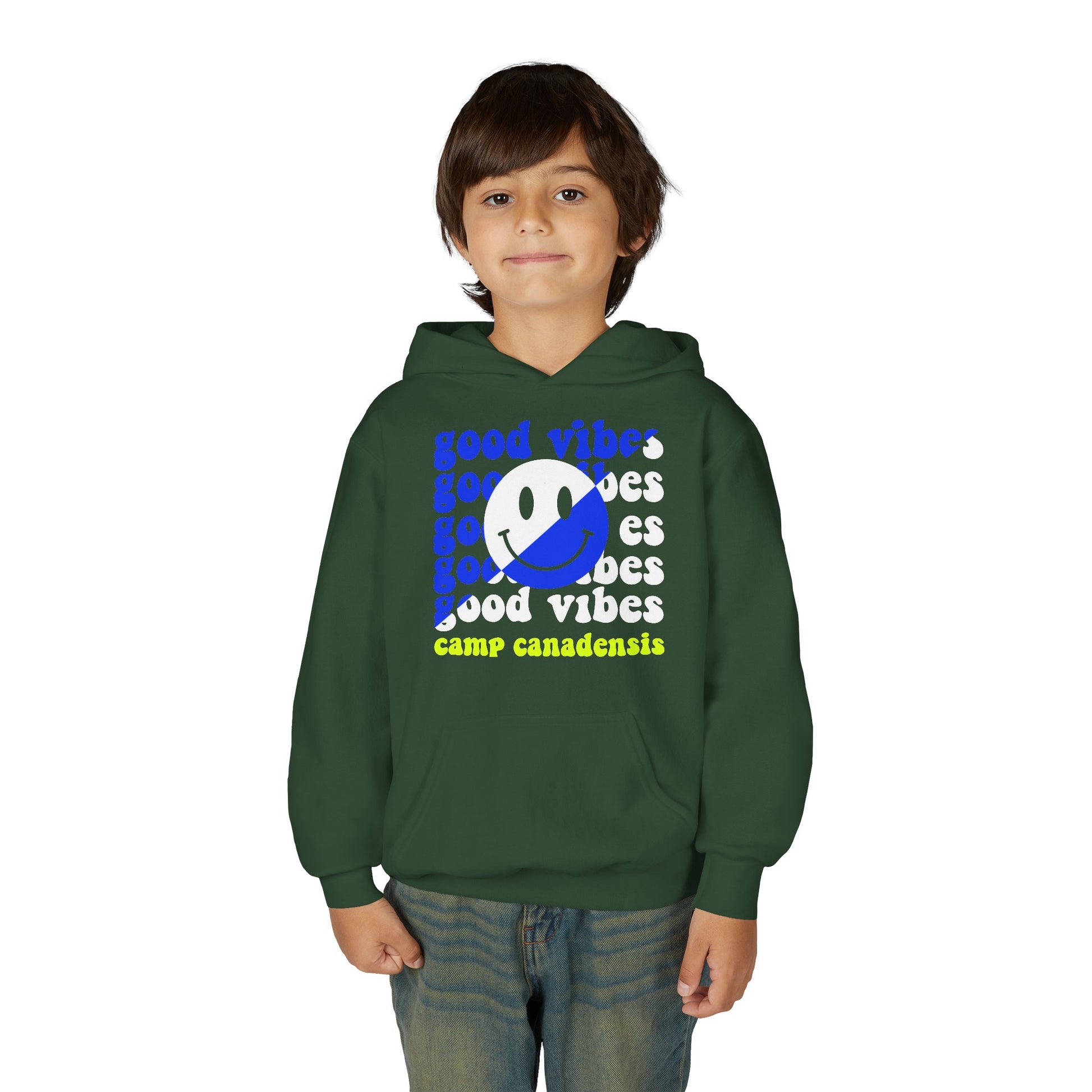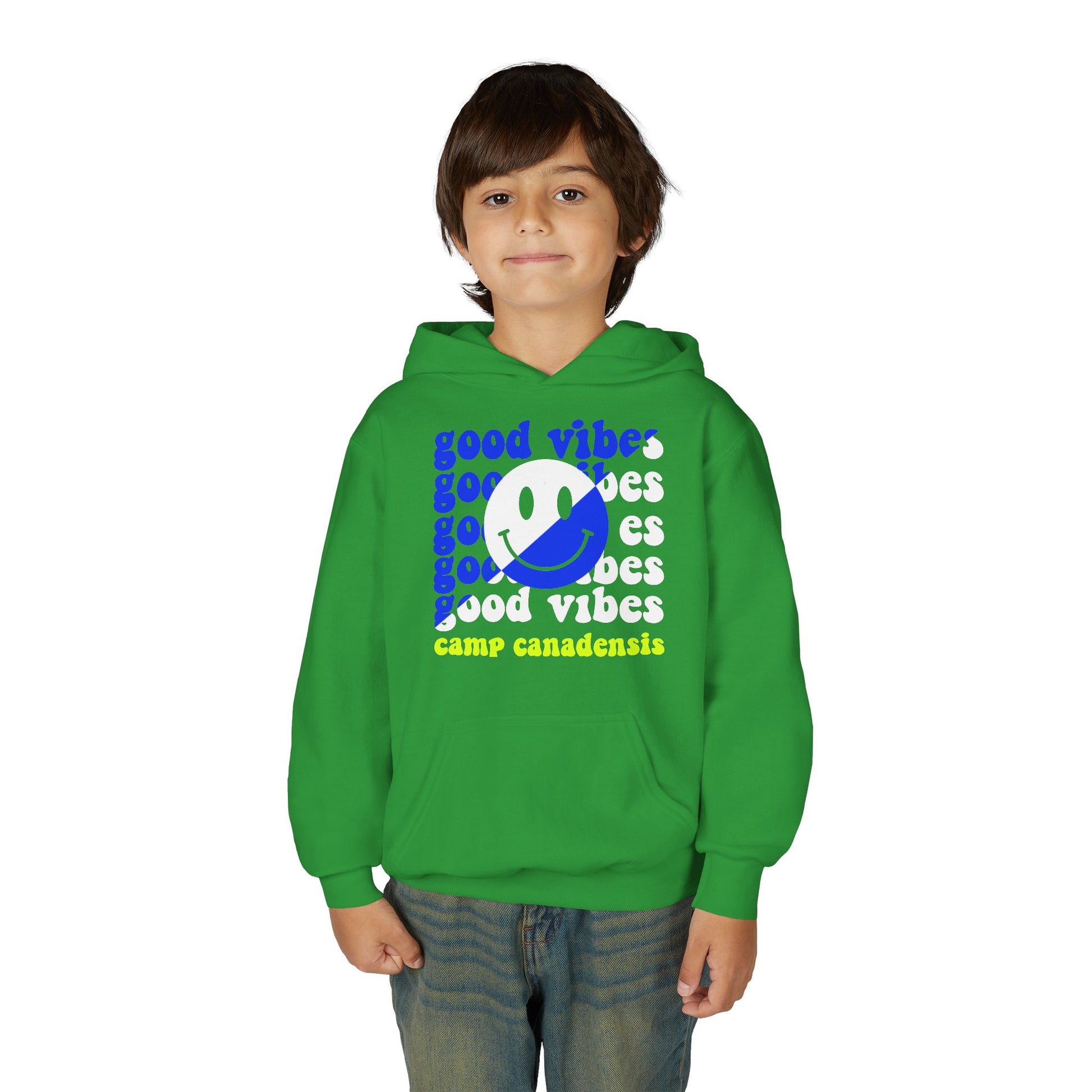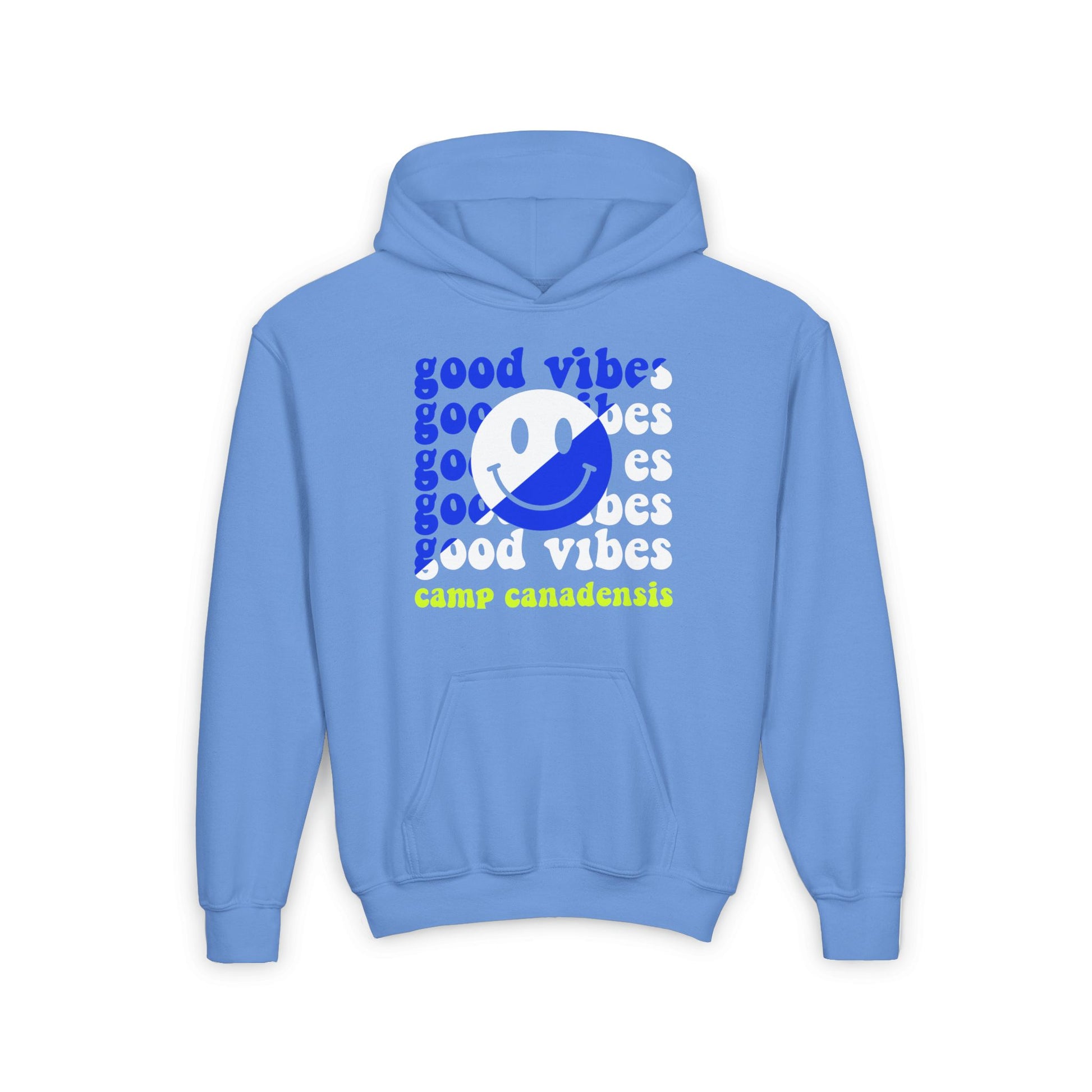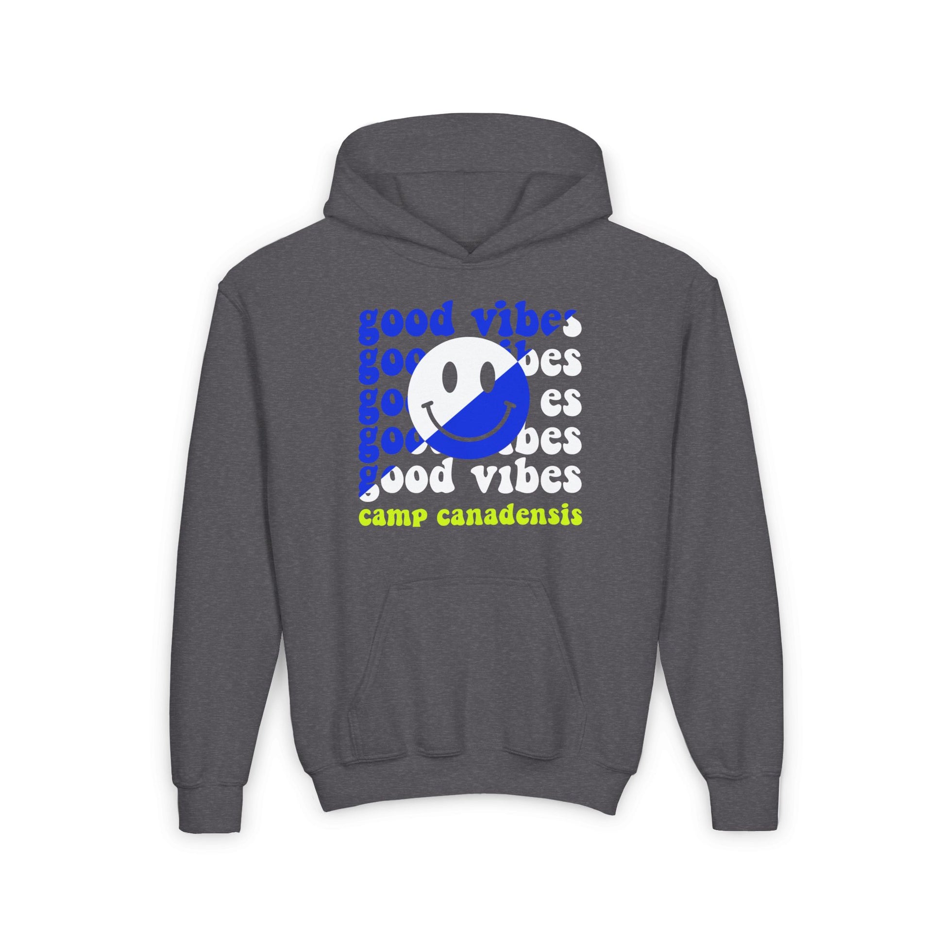 Customizable split text design crewneck sweatshirt perfect for camp swag, school spirit, or sports team. Provides a cozy and comfortable feel with a spacious kangaroo pouch pocket. Relevant for children's wear, ideal for school events, sports practices, and casual outings.
