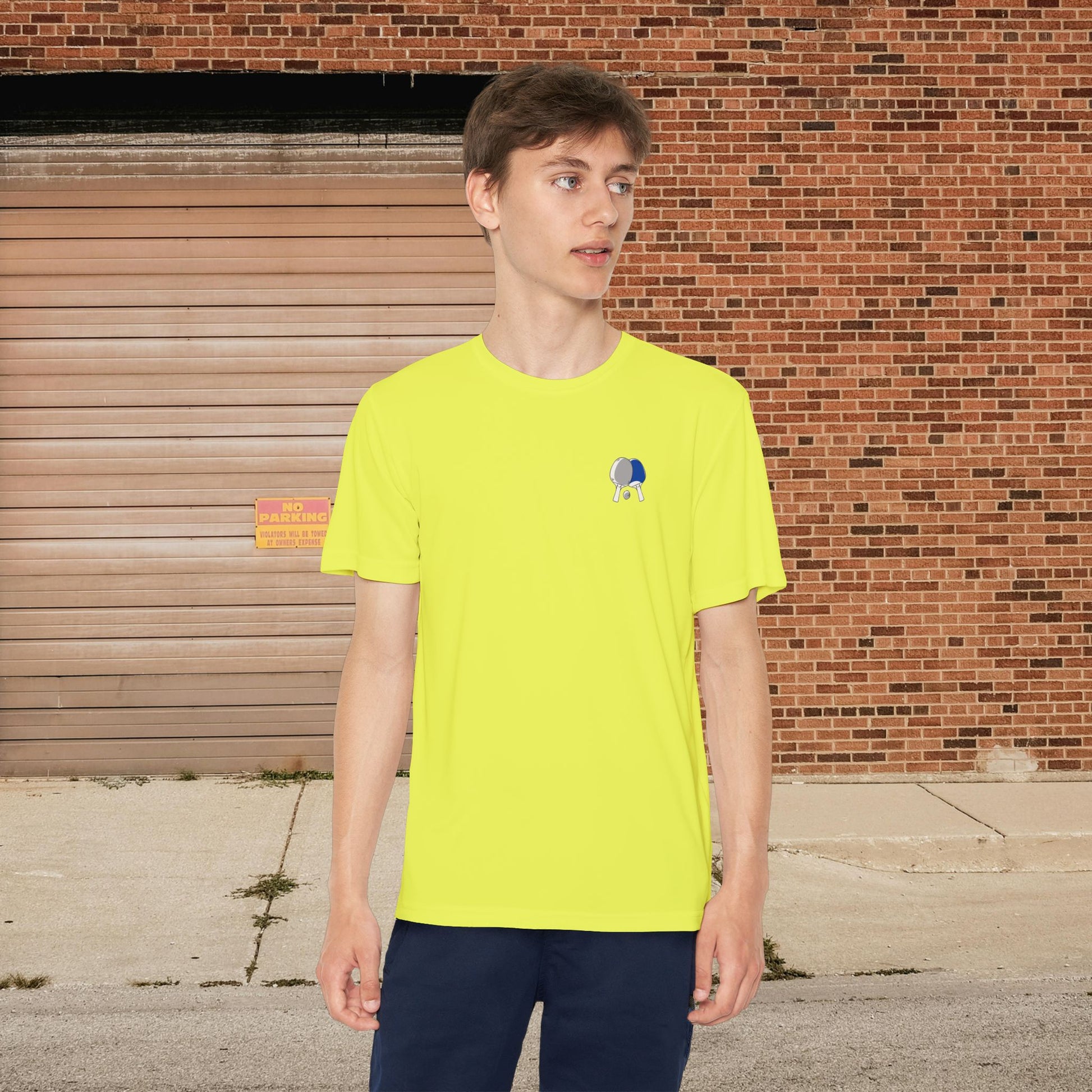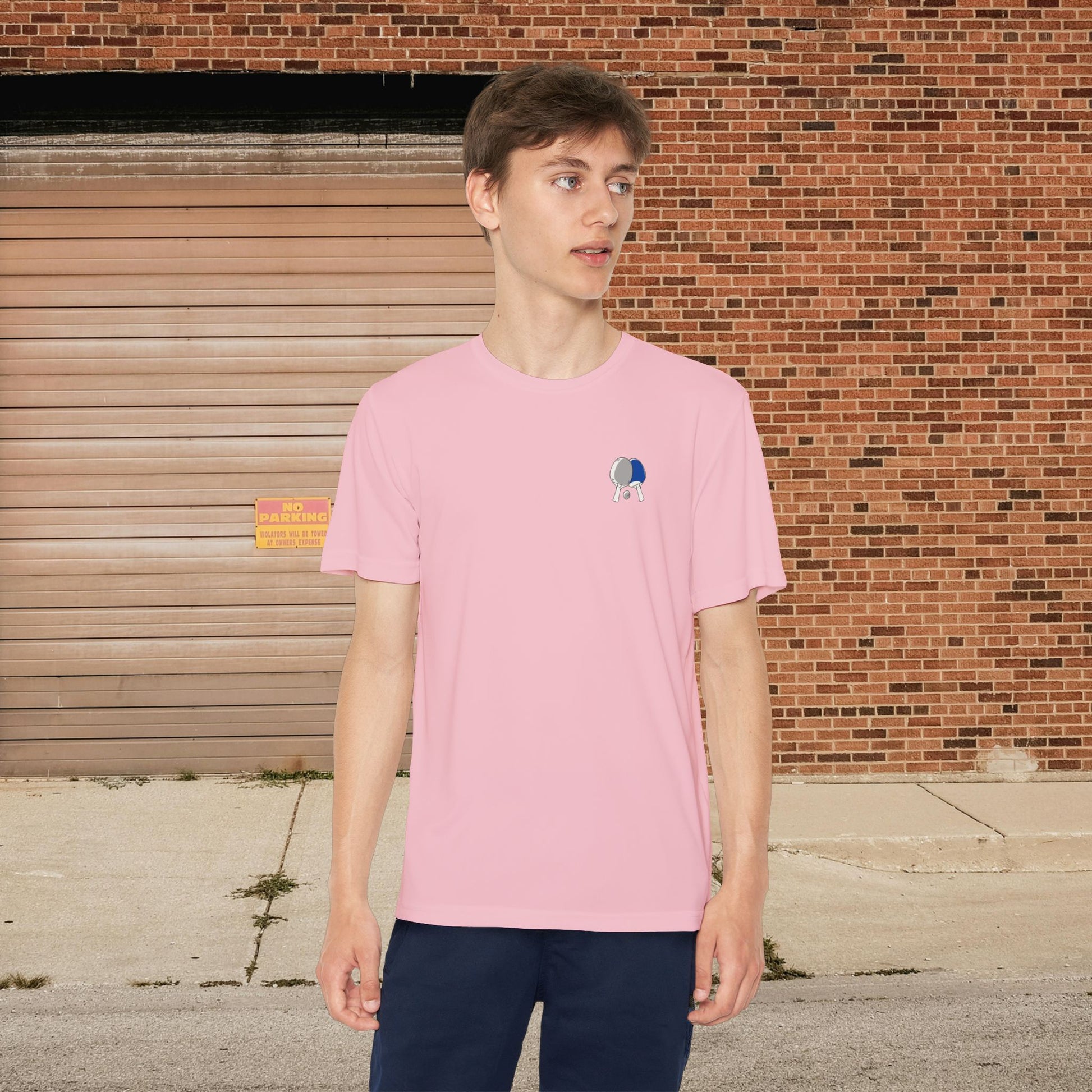 Custom swag ping pong inspired tee made of 100% polyester moisture-wicking material. Perfect for active individuals looking for a comfortable and stylish shirt. Great for ping pong enthusiasts and sports lovers. Ideal for casual wear, sports events, and athletic activities.
